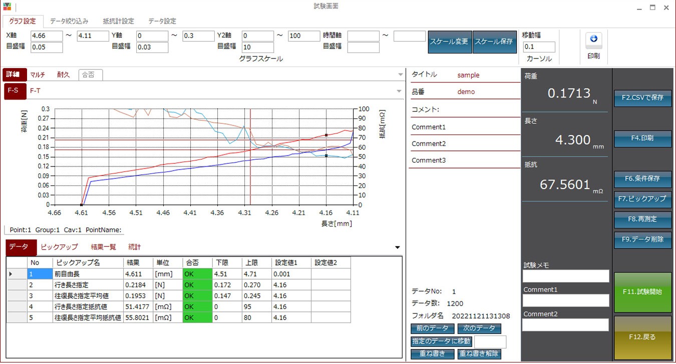 The progress of each test can be monitored via graphical display, and the entire sequence from evaluation to statistical processing can be performed directly on the tester. Once test conditions are set, they are stored in the machineʼs memory, eliminating the need for reconfiguration during repeat tests and allowing for easy test startup.